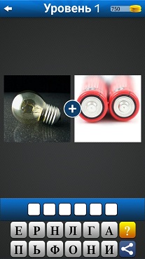 2 картинки 1 слово - 1 уровень 1. Открученная лампочка 2. Две пальчиковые батарейки Ответ: ФОНАРЬ |