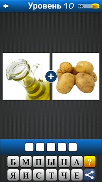 2 картинки 1 слово - 10 уровень 1. Подсолнечное масло в стеклянной вазе 2. Несколько картофелин Ответ: ЧИПСЫ |