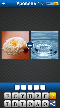 2 картинки 1 слово - 15 уровень 1. Белок и желток в муке 2. Блюдце с водой Ответ: ТЕСТО |