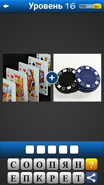 2 картинки 1 слово - 16 уровень 1. Несколько карт высоких мастей 2. Несколько игральных фишек из казино Ответ: ПОКЕР |