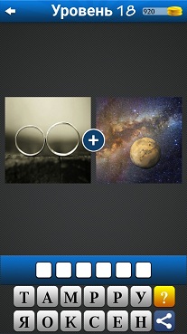 2 картинки 1 слово - 18 уровень 1. Два металлических кольца 2. Планета в космосе Ответ: САТУРН |