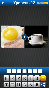 2 картинки 1 слово - 23 уровень 1. Яичный желток с беконом 2. Чашка с кофе Ответ: ЗАВТРАК |