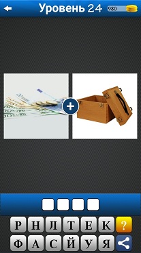 2 картинки 1 слово - 24 уровень 1. Несколько крупных купюр 2. Деревянный ящик с замками Ответ: СЕЙФ |