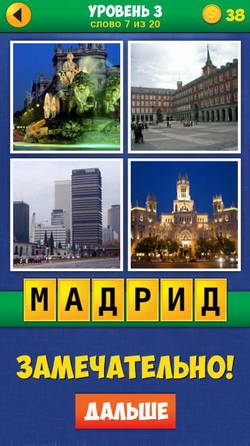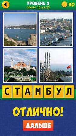 Прекрасная новость для всех поклонников игры 4 фото 1 слово - готовы ответы на третий уровень головоломки! Задание не меняется - вам нужно угадать слово, которое объединяет 4 различные картинки. Это может быть название достопримечательности, города или же страны. Некоторые из них вы сможете отгадать с легкостью. Однако каждый, кто играл в 4 фото 1 слово знает, что с наскока эту головоломку не возьмешь. Прохождение 4 фото 1 слово займет у вас долгие часы, даже если вы весьма эрудированный человек и можете похвастаться недюжинными знаниями по географии. В 4 фото Путешествие они очень нужны! Если у вас закончились игровые подсказки, нет сил и наличных в кармане (как вы помните, подсказки можно приобрести за реальные деньги), у вас все-таки остался шанс пройти третий уровень 4 фото 1 слово Путешествие. Ответы на игру есть у нас! И мы готовы поделиться ими с вами. Ниже вы сможете найти подсказки на все 20 заданий уровня с детальным описанием картинок и скриншотами. Теперь у вас все получится! Если вам понравились ответы, ставьте лайки. Нам будет приятно, а вы скорее получите шпаргалку с ответами на следующий уровень!