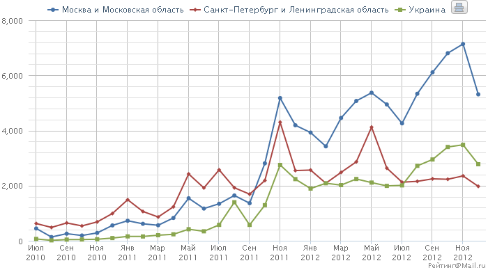 Ещё год назад количество москвичей, заглядывающих на мой сайт, превысило количество Питерцев и уже не снижалось. В том же сентябре 2011-го резко выросла Украинская аудитория сайта, достигнув почти 11% от общей массы. Показатель держится до сих пор на уровне 8-11% и увеличивается пропорционально общему росту посещаемости, поэтому пора бы сделать шаг навстречу читателям и подумать немного об их удобстве!