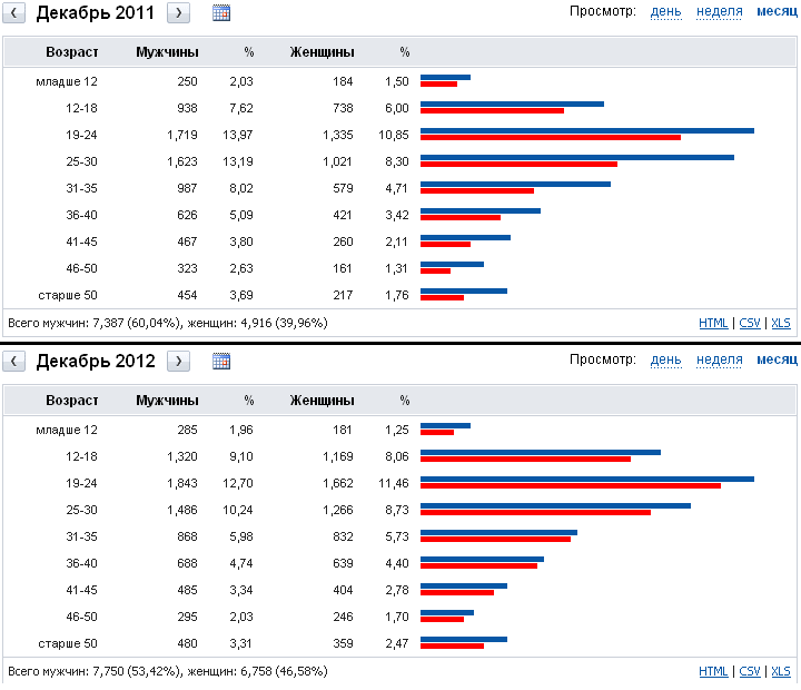 Увеличилась доля пользователей в возрастной группе от 12 до 18 лет, довольно сильно подросла женская аудитория. Если в декабре 2011 года гендерное разделение было ровно 60 на 40 (60% мужчин и 40% женщин), то теперь разница сильно сократилась: 53% мужчин на 47% женщин! Причём нельзя сказать о каком-то прорыве в определенной возрастной группе: все они подросли в среднем на 0,75%, отняв их у мужской половины населения. Однако, это не самая приятная динамика: сайт потерял 3% посетителей-мужчин в возрасте от 25 до 30 лет и 2% в возрасте от 31 до 35, а это - самая активная часть потребительской аудитории и самые ярые пользователи контекстной рекламы, которая и приносит доход сайту. Будем надеяться, что прирост женской аудитории восполнит эту нехватку!
