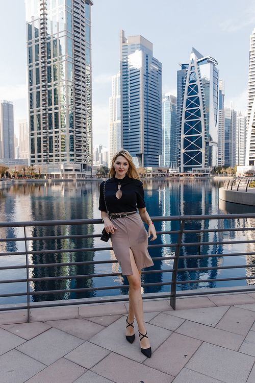 Мы начали в кафе на окраине живописного района Jumeirah Islands с деловой съёмки (с ноутбуком и кофе), затем прошлись по его зелёным дорожкам и дошли до искусственных озёр Jumeirah Lakes Towers. Моя модель сменила несколько нарядов