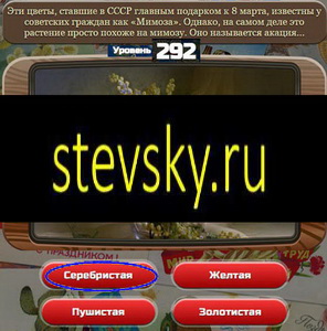 Уровень 292 Эти цветы, ставшие в СССР главным подарком к 8 марта, известны у советских граждан, как "мимоза". Однако, на самом деле это растение просто похоже на мимозу. Оно называется акация...?