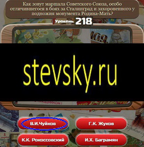 Уровень 218 Как зовут маршала Советского Союза, особо отличившегося в боях за Сталинград и захороненного у подножия монумента Родина-Мать?