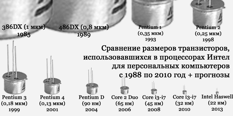 С годами увеличивалась тактовая частота процессоров Intel. В основном за счёт уменьшения размеров транзисторов и увеличения их числа на стандартной площади микроустройства, а также благодаря появлению различных полупроводниковых технологий, новых материалов для производства элементов процессоров и даже переосмыслению машинных методов обработки информации. Сейчас микропроцессор - это сложнейшее устройство, сопоставимое по своей многофункциональности с целым машинным комплексом десятилетней давности. Вычислительная мощь современного настольного компьютера равна или даже превосходит вычислительную мощь первого суперкомпьютера в тысячи раз, при том что размеры его в тысячи раз меньше. Наглядный пример - сравнение размеров транзисторов, использовавшихся в процессорах с 1988 года по настоящий день, приведенное на следующей картинке: