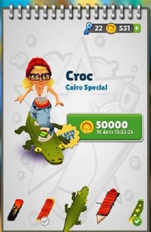 Subway Surfers Cairo- это еще одна часть приключений хулигана Джейка и его команды. Эта компания уже исколесила весь мир, в некоторые места ребята заглядывали несколько раз. Вот наста очередь Африки. Этот континент в игре Subway Surfers представляет метро столицы Египта – Каира. Подземка в этой части планеты мало чем отличается от других. Тут те же поезда и вагоны, разве что выкрашены в другой цвет. Стены в метро так же выкрашены в «египетском» стиле. Так же, помимо всего прочего, героям игры Сабвей Серферс нужно собирать скарабеев, что бы получать различные бонусы. Нашим героям, как и в других местах просто необходимо оставить свой фирменный рисунок на вагонах и стенах метрополитена. Но, как и везде, им будет мешать толстый охранник с мелкой собачонкой. Вот как бы и все, что нас ожидает в стране фараонов.