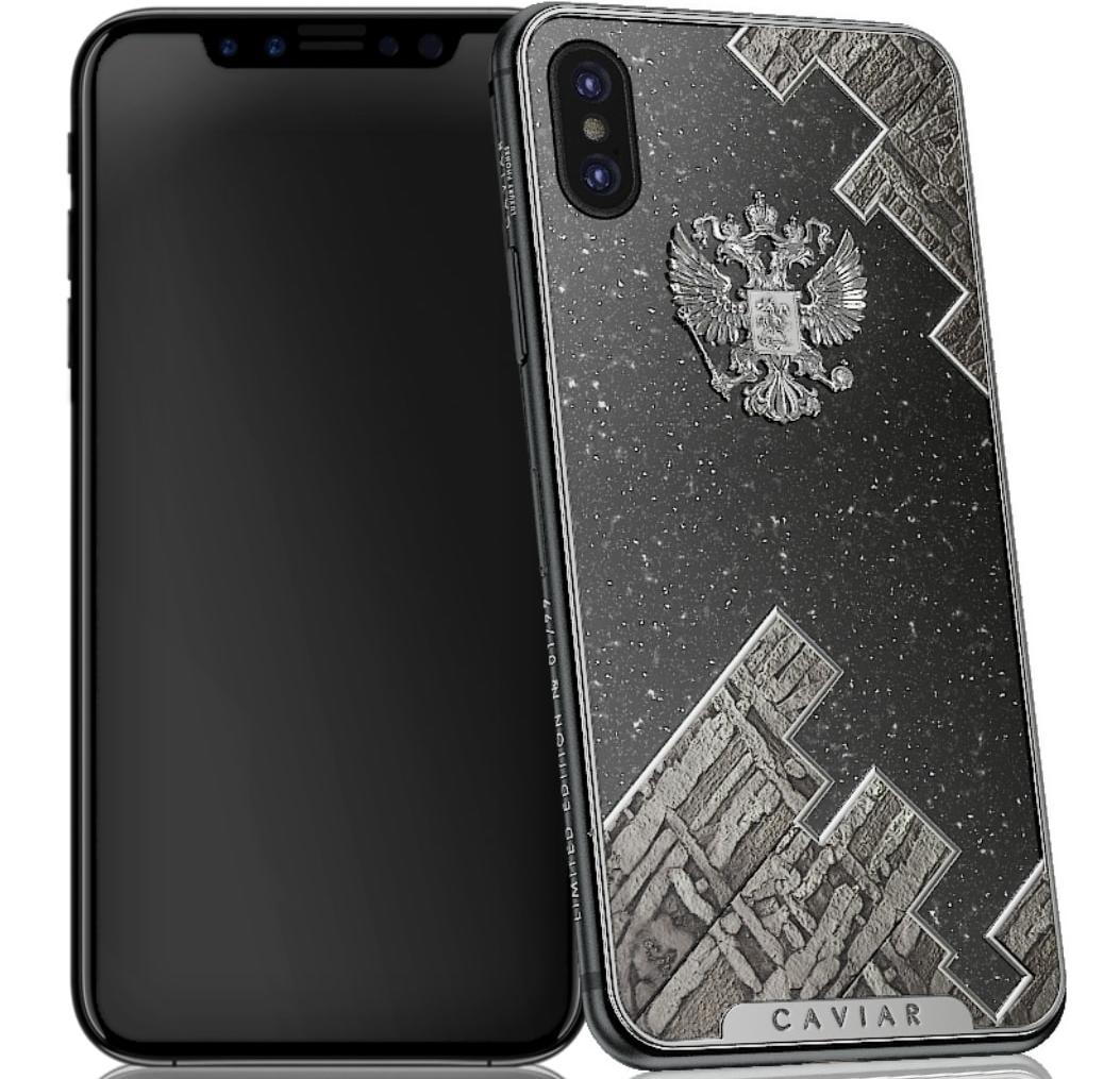 Вообразите себе - метеоритный камень Сеймчан, украшающий iPhone X от Caviar. Он впервые был обнаружен в 1967 году, в Магадане. Кроме того, изайн смартфона посвящен великим достижениям России в космической сфере. Материалы: белое золото (герб), элементы метеорита. Цена от 244 000 рублей.