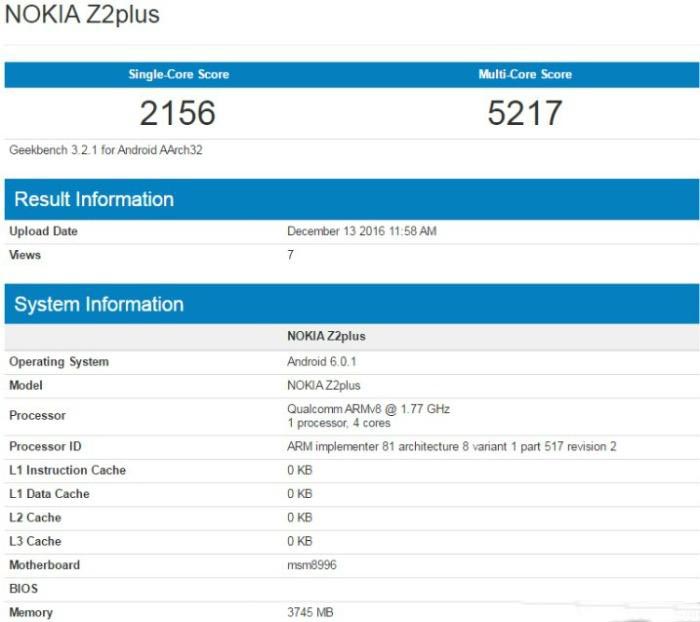 Еще раз напомним заявление компании HDM Global о том, что в 2017 году под брендом Нокиа выйдет минимум шесть устройств, охватывающих все сегменты рынка. О бюджетниках и флагмане мы немного написали, теперь пришел черед рассказать о субфлагмане Nokia Z2 Plus. Этот девайс финского происхождения получит топовое железо середины 2016 года, а занчит сердцем смартфона станет производительный Snapdragon 820. Помимо самих характеристики, в сети имеются даже скриншоты прохождения смартфоном Nokia Z2 Plus синтетического теста в GeekBench, но об этом немного позже.