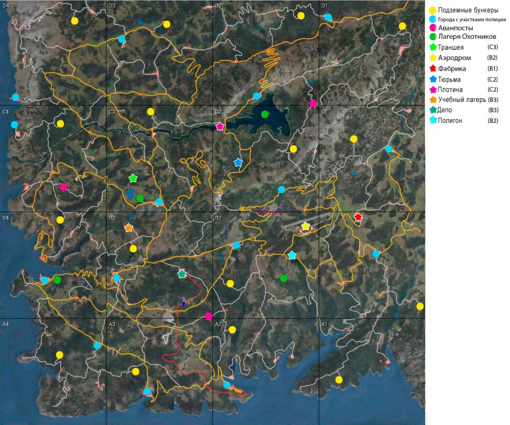 Без хорошего лута в СКАМ вы никто. Поэтому его нужно уметь искать и нужно знать где искать. Лут в каждой катке на карте выкатывается в рандомном порядке, поэтому никто не знает, где будет «грибное» место. Для того чтобы найти конкретные места в SCUM, вам нужно зажать кнопку М – после этого появится карта местности. Ниже мы прикладываем картинку, где размещается самый полезный лут в SCUM. skum karta